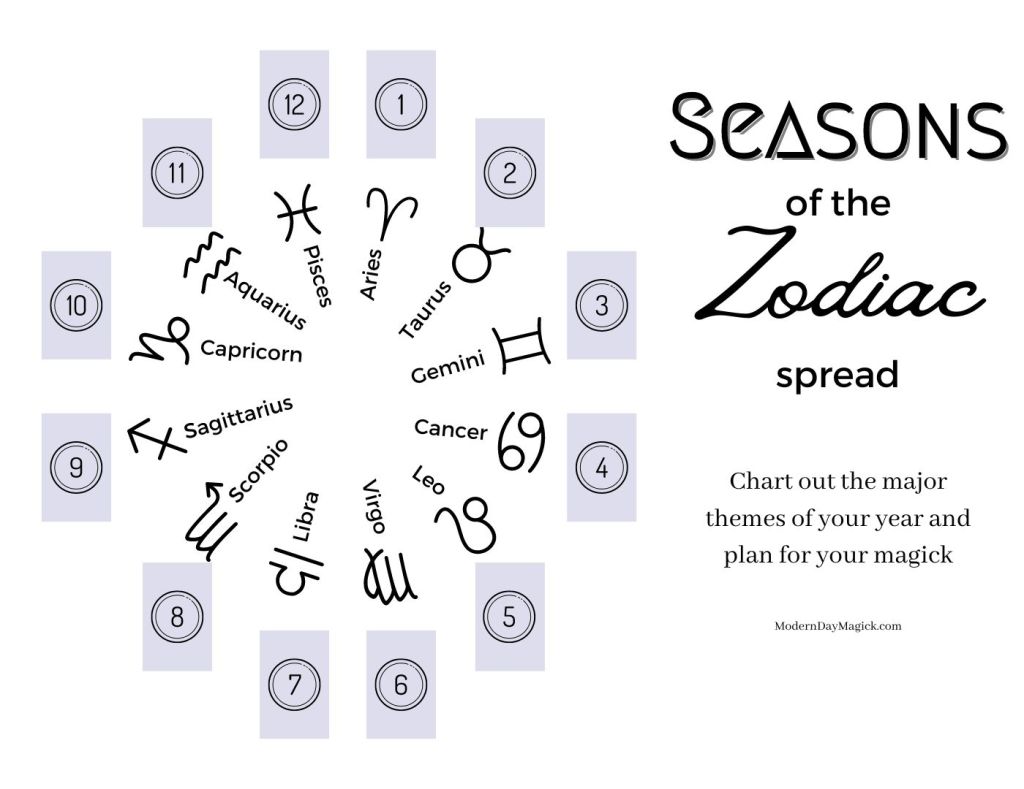 So I devised this Tarot spread to help me get a glimpse into the next year! Doing a circular spread to check out the upcoming 12 months isn’t a revolutionary idea, but most people go by month. This spread is a little different: each card is relating to a new zodiac season, and can be interpreted based on the themes of that sign.